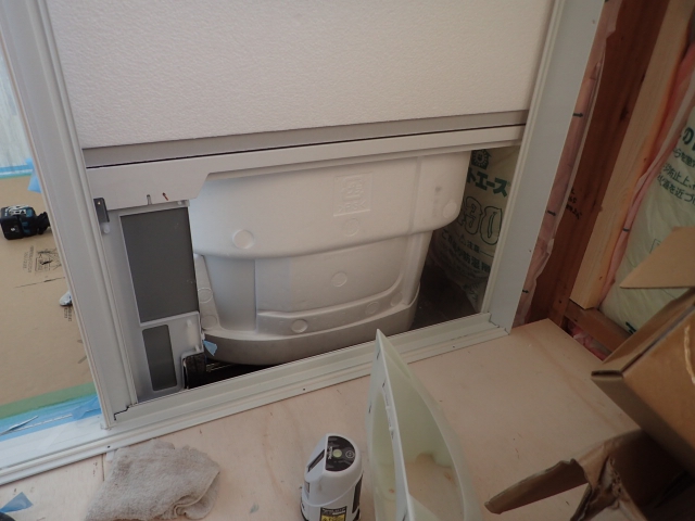ユニットバス組立です。浴槽の断熱材が見えます。