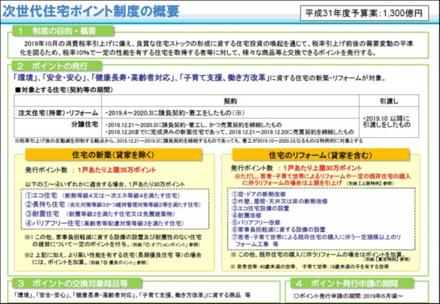 次世代住宅ポイント制度は、2019年10月の消費税率引上げに備え、良質な住宅ストックの形成に資する住宅投資の喚起を通じて、消費者の需要を喚起し、消費税率引上げ前後の需要変動の平準化を図ることを目的とし、税率10%で一定の性能を有する住宅の新築やリフォームに対して、様々な商品等と交換できるポイントを発行する制度です。